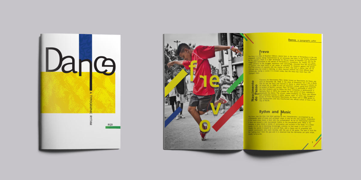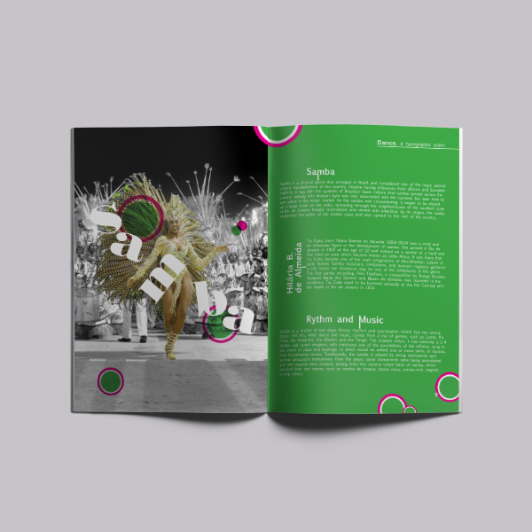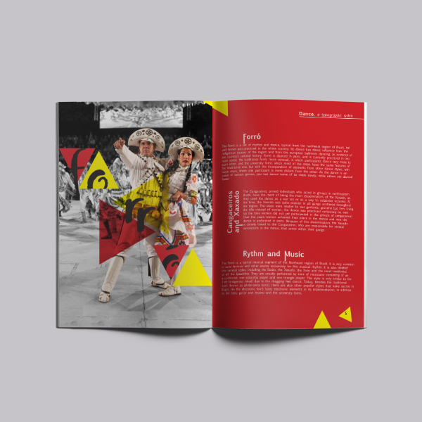 This is a booklet created for the Regroupement québécois de la danse. It is meant to present different styles and dances from the brazilian culture for the reader through its coulourful approach and vibe. The design’s intent is to give the reader the energetic and engaging vibration of music and Brazilian dances.