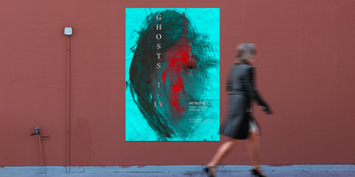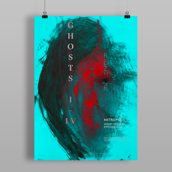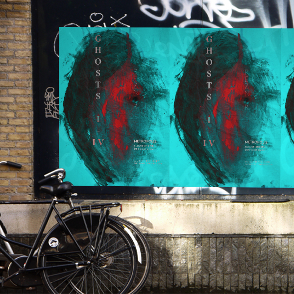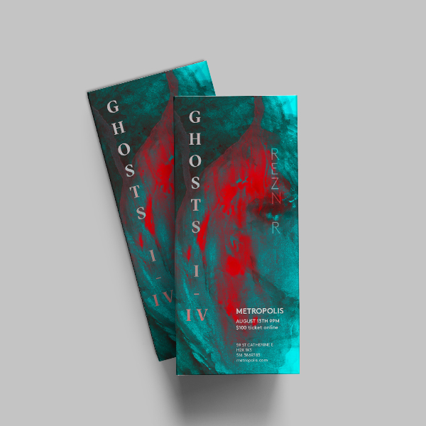 Promotional design kit for Nine Inch Nails’ exclusive concert of the album Ghosts. The design was inspired by the strong mix of feelings from rage to passion, despair and hope, the design reflects these dualities present in the album. With the strong contrasting colors and organic shape but also very decisive typefaces. The design ambitiously encompasses the qualities present in Ghosts’ album.