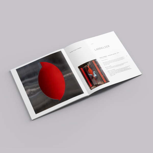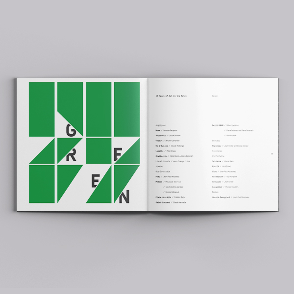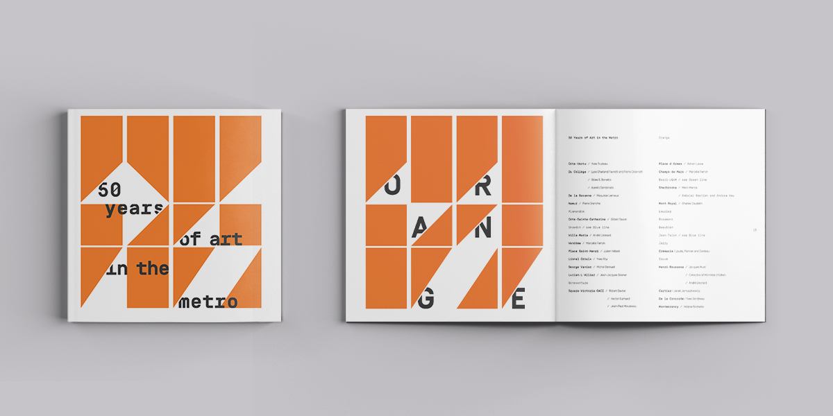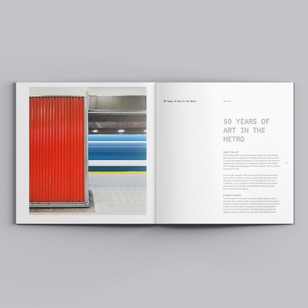 Publication to celebrate the 50 years of art in Montreal's metro. The design was inspired by speed, art and tiles. The theme aim to convey that within the diversity of art pieces found in the metro you have a middle ground where the metro itself is the art gallery for these arts. The grid and image placement is arranged in a clear airy way, so text and image are equally appreciated.